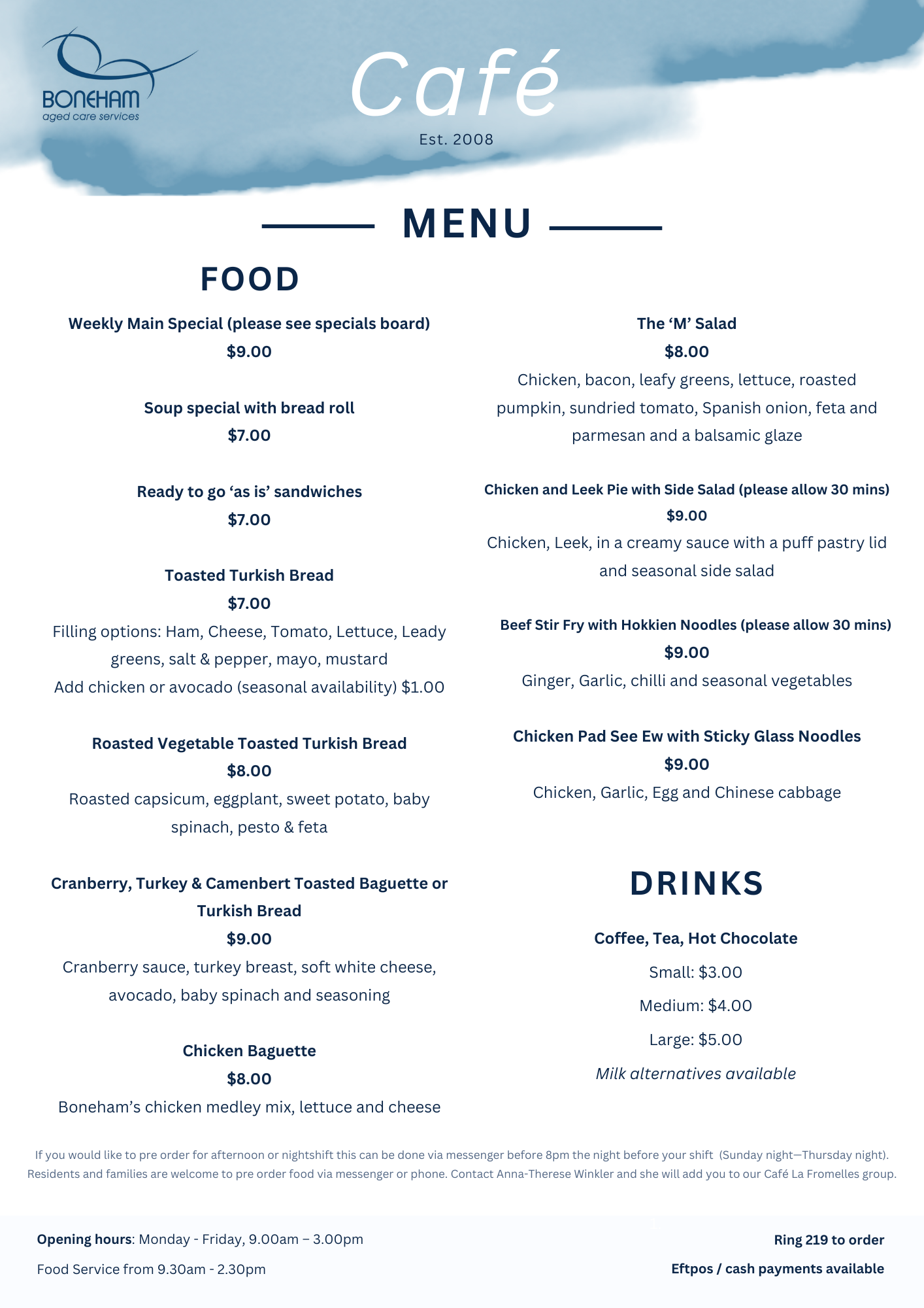 Run by our dedicated staff , it is open Monday to Friday from 9.00am - 3.00pm. It is also the venue for numerous celebrations to mark residents’ milestones.